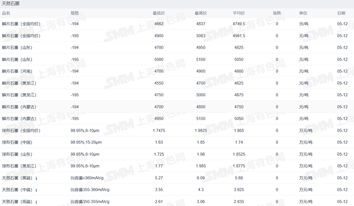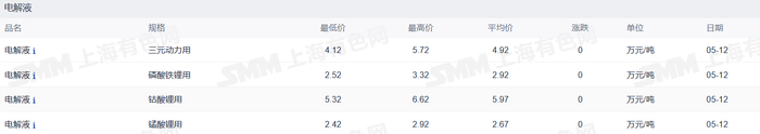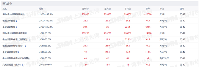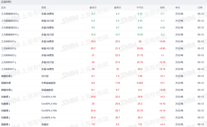 根据上海有色网数据,截至5月12日,电池级碳酸锂均价24.2万元/吨,工业级碳酸锂均价22.75万元/吨;电池级氢氧化锂(56.5%国产粗颗粒)均价22.75万元/吨,工业级氢氧化锂均价20.2万元/吨。三元材料方面,523多晶、523单晶、622多晶、811多晶(动力型)均价分别报每吨20,20.95,21.75,25.75万元。