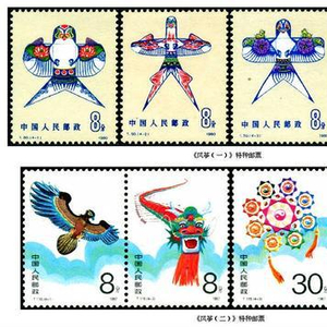 1987年4月1日发行第二组《风筝》特种邮票,全套4枚,图案分别为“鹰”“龙头蜈蚣”“八卦”和“凤凰”。这套邮票是为山东潍坊国际风筝节而发行的。山东是风筝的发祥地之一,而潍坊则被誉为“风筝之都”。 2006年5月,潍坊风筝被列入第一批国家级非物质文化遗产名录。潍坊风筝以其独特的艺术个性,代代相传,逐渐形成了选材考究、造型精致、色彩鲜艳、品种繁多的传统风格与艺术特色。它的代表作是“龙头蜈蚣”“苍鹰”等。其中最引人注目的莫过于那巨型的“龙头蜈蚣”了。这庞然大物全长30多米,一节节伸展开可高过十层楼房。此组《风筝》邮票为了区别第一组《风筝》邮票平面展示4种京式扎燕的设计方式,则让4枚图案有动感,造成一种仰视的视觉感,好似风筝在天上飘逸盘旋,并在背景上用深浅的蓝色调装饰成云彩,增强了风筝放飞空中的立体感。