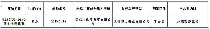 中国质量新闻网梳理发现,鞋产品方面抽查出1批次不合格产品。涉及标称上海回力鞋业有限公司(以下简称“上海回力鞋业”)生产的“回力”WXJ(TJ)-0140 型休闲健康鞋【规格型号:235(2.5)】被检出外底耐磨性能项目不合格。