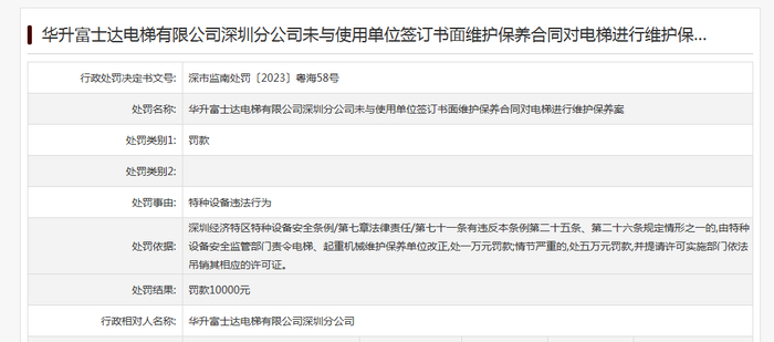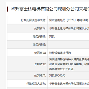 华升富士达电梯深圳分公司近年来多次因特种设备违法行为被处罚