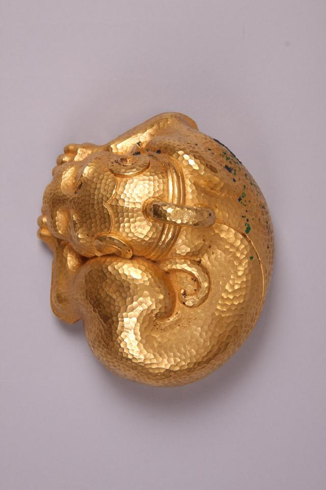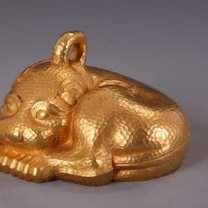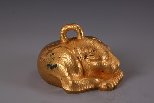 金兽的实际用途也有几种说法。第一种说法是镇,即席镇,用来压席子的四个角。头顶后部跨项圈两侧,有一粗壮的环纽,方便使用时的提拿,以硕大工精的纯金兽作为席镇,彰显了使用者高贵且特殊的身份。