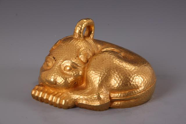 中国早期通常所见的金器制作,一种是铸造,用模具形成特定形状的黄金制品;另一种是用敲、锻、锤来塑造金器表面的花纹。“金兽却是古代金属铸造工艺和锤揲(yè)工艺这两种技法完美结合的产物,体现了中国古代发达的科技和艺术水平实属罕见,弥足珍贵。”谢博说。