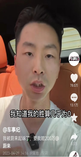 鉴于此,蔚来汽车不得不在2022年8月对“车事纪”提起诉讼,并索赔200万元。该案在被媒体曝光后,车事纪主播也在随后的视频中承认了自己“胜算几乎为0”,但即便这样,其为了逃避责任,仍希望以舆论压力对抗司法公正。