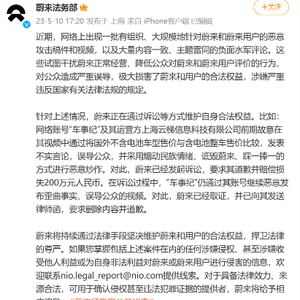 5月10日,“蔚来法务部”在社交平台重磅发文,直陈最近网络上出现一大批有组织、大规模针对蔚来和蔚来用户的恶意攻击稿件和视频,以及大量内容一致、主题雷同的负面水军评论,对公众造成严重误导,极大损害了蔚来和用户的合法权益,并表示将公开征集侵权线索。