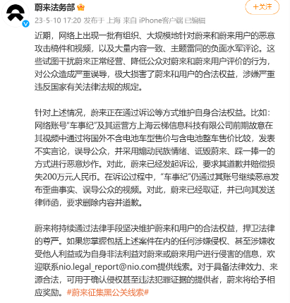 同时,网络账号“车事纪”及其运营方长期以来对蔚来的侵权行为被重点提及:“网络账号‘车事纪’及其运营方上海云梯信息科技有限公司前期故意在其视频中通过将国外不含电池车型售价与含电池整车售价比较,发表不实言论,误导公众,并采用煽动民族情绪、诋毁蔚来、踩一捧一的方式进行恶意炒作。对此,蔚来已经发起诉讼,要求其道歉并赔偿损失200万元人民币。在诉讼过程中,‘车事纪’仍通过其账号继续恶意发布歪曲事实、误导公众的视频。对此,蔚来已经取证,并已向其发送律师函,要求删除内容并道歉。”
