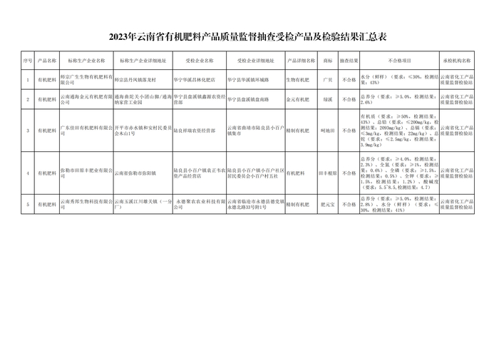 有机肥料是指来源于植物和(或)动物,经过发酵腐熟的含碳有机物料,其功能是改善土壤肥力、提供植物营养、提高作物品质。本次监督抽查抽样区域覆盖了玉溪市等3个州、市,共抽取5批次样品,经检验,5批次均不合格。发现的不合格项目有:养分、有机质、酸碱度和水分。不合格产品的标称生产企业涉及师宗广生生物有机肥料有限公司、云南通海金元有机肥有限公司、广东佳田有机肥料有限公司、弥勒市田原丰肥业有限公司、云南秀邦生物科技有限公司。