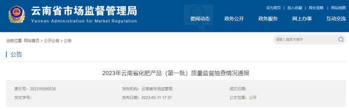 中国质量新闻网讯 2023年5月11日,云南省市场监督管理局网站发布2023年云南省化肥产品(第一批)质量监督抽查情况通报。
