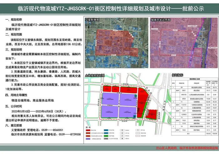 根据临沂现代物流城建设发展的需要,为了加快推进物流西迁项目的落地实施,本着集约节约用地,优化空间布局的原则,编制街区控制性详细规划。