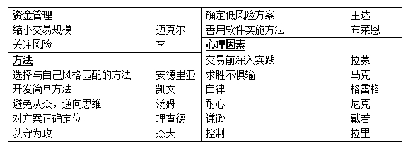 在本部分,作者总结了十五位市场大师给怀揣梦想的交易者提出的建议,让读者能够近距离的了解这些成功交易者的思想,篇幅所限,在这里仅做总结。