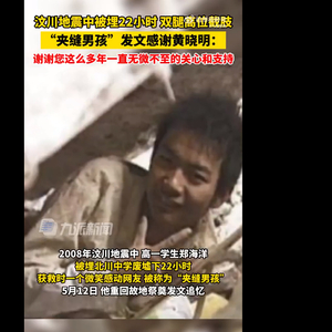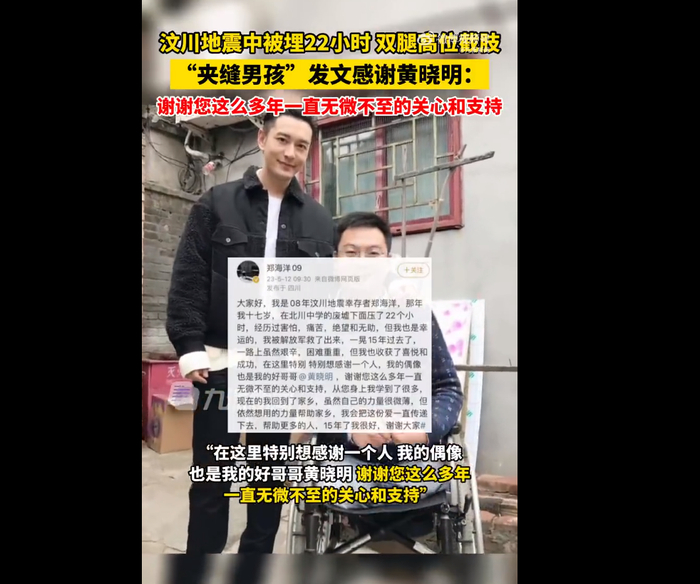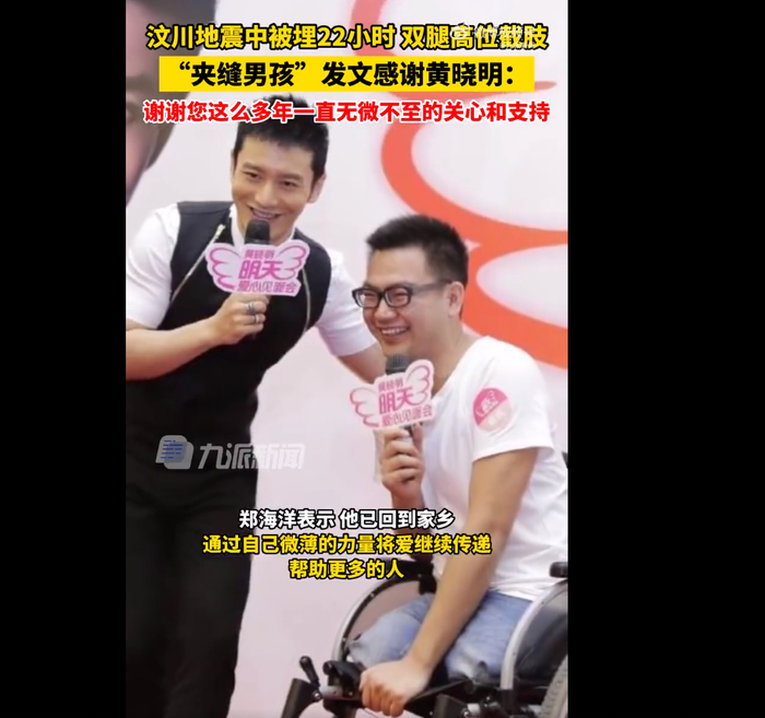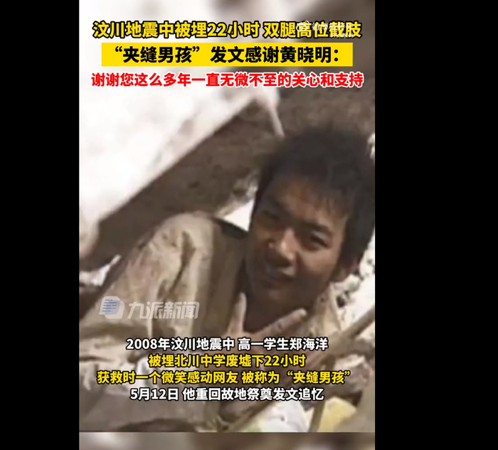 2008年的汶川地震中,@郑海洋09 在废墟下被埋22个小时,获救时一个微笑感动网友。失去双腿的他,因在夹缝中被困,被称为“夹缝男孩”。5月12日,郑海洋发文追忆:那年我十七岁,在北川中学的废墟下面压了22个小时,经历过害怕,痛苦,绝望和无助,但我也是幸运的,我被解放军救了出来,一晃15年过去了,一路上虽然艰辛,困难重重,但我也收获了喜悦和成功。在这里我特别想感谢一个人,我的偶像也是我的好哥哥@黄晓明 ,谢谢您这么多年一直无微不至的关心和支持,从您身上我学到了很多。5月12日,黄晓明回应称,海洋,要继续加油喔!