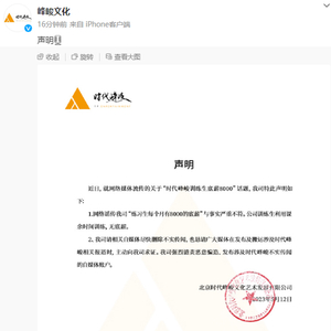 今(12)日,针对网传的“时代峰峻训练生底薪8000”话题。时代峰峻方发布了声明,称:网络谣传我司“练习生每个月有8000的底薪”与事实严重不符。公司训练生利用课余时间训练,无底薪。