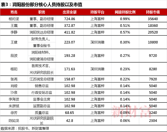 按照润阳股份发行市值400亿元测算,则将有4位高层持股市值在亿元以上,多名核心人员身家超过千万元(表3)。身家更高还是陶龙忠和创业搭档范磊,上市后持股36.25%、8.94%,身家各自约145亿元,36亿元;陶龙忠将成为“新财富500富人”一员。