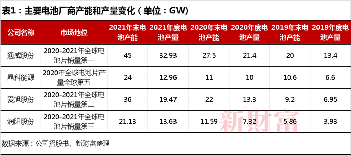 至2021年末,润阳股份产能超过21GW,较2020年末接近翻倍,大约是2019年末的3.6倍;产量13.63GW,略超过晶科能源(12.96GW),但低于通威股份(32.93GW)、爱旭股份(19.47GW),蝉联全球第三(表1)。