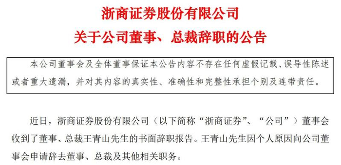 5月12日,浙商证券发布公告官宣了总裁王青山的职务变动。公告显示,近日,浙商证券董事会收到了董事、总裁王青山的书面辞职报告。王青山因个人原因向公司董事会申请辞去董事、总裁及其他相关职务。