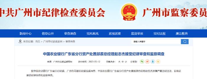 5月12日,广州市纪委监委官网通报显示,中国农业银行广东省分行资产处置部原总经理赵忠杰涉嫌严重违纪违法,目前正接受纪律审查和监察调查。