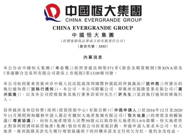 公告称,该仲裁涉及和信恒聚(深圳)投资控股中心于2016年12月及2020年11月期间与相关被申请人签订有关恒大地产集团有限公司的增资及相关协议,向恒大地产增资人民币50亿元以取得恒大地产约1.6%股权。恒大地产终止对深圳经济特区房地产(集团)股份有限公司的重组计划,仲裁申请人要求本公司、恒大地产、广州凯隆及许家印履行增资协议项下的回购承诺及支付尚欠分红、违约金及收益。