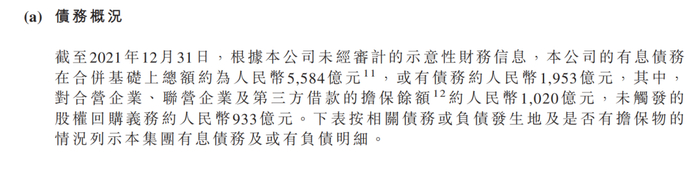 而根据公告,恒大未经审计的示意性财务信息显示,截至2021年12月31日,公司的有息债务在合并基础上总额约为5584亿元,或有债务约1953亿元,仅境内外有息及或有债务总额就高达7537亿元。其中,对合营企业、联营企业及第三方借款的担保余额约1020亿元,未触发的股权回购义务约933亿元。