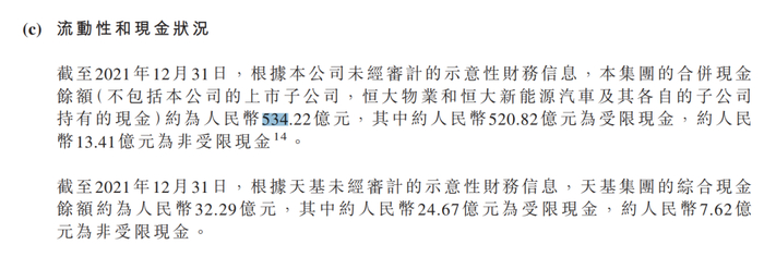 据中国恒大今年3月22日发布的公告显示,恒大集团现金余额(不包括恒大集团的上市子公司、恒大物业和恒大汽车及其各自的子公司持有的现金)约为534.22亿元,仅13.41亿元为非受限现金;天基集团的综合现金余额约为32.29亿元,7.62亿元为非受限现金。恒大的可支配现金仅有21.03亿元。