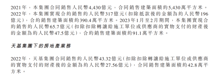 房地产业务方面,2021年,恒大地产实现合同销售4430亿元;2022年,恒大地产实现合同销售约317亿元,天基集团为43.32亿元;2023年1月至2月,恒大地产实现合同销售约65.7亿元。物业管理业务方面,恒大物业2021年实现收入约145.86亿元。