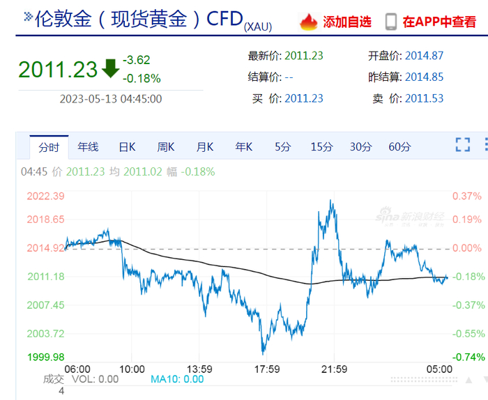 截至当地时间5月12日收盘,伦敦金(现货黄金)CFD报2011.23每盎司。