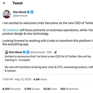 当地时间5月12日,推特现任CEO埃隆·马斯克(Elon Musk)发布推特称已正式任命康卡斯特(Comcast)旗下NBCUniversal的广告主管琳达·亚卡里诺(Linda Yaccarino)为推特新CEO。