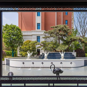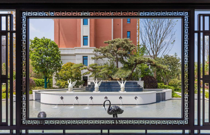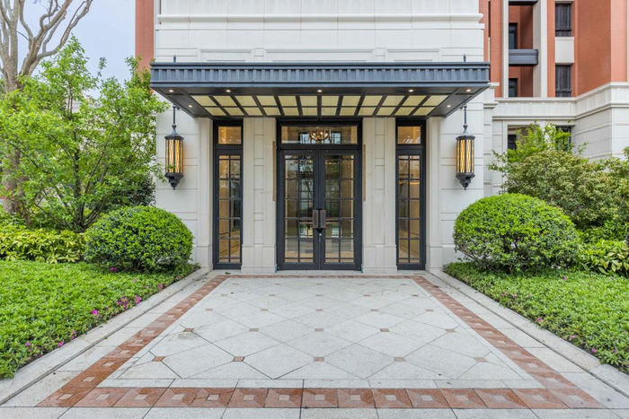 它可以对品质做最传统的坚守,社区景观打造上用石材、紫铜材质,外立面设计沿袭海派建筑风格,采用红砖结合石材+铝板,质感十足,地砖采用拼花式铺装手法,花坛以手工雕刻花纹,复古稳重。