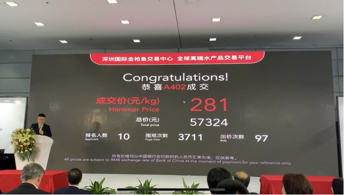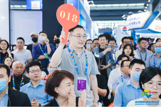 深圳国际金枪鱼交易中心系统首单线上拍卖交易后,活动现场举办了线下高端水产品拍卖。将蓝鳍金枪鱼为代表的一批高端水产品,以公开拍卖的形式向公众进行推介,充分体现渔博会集聚高端商贸的平台作用。