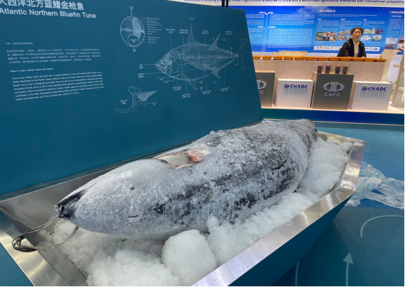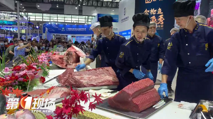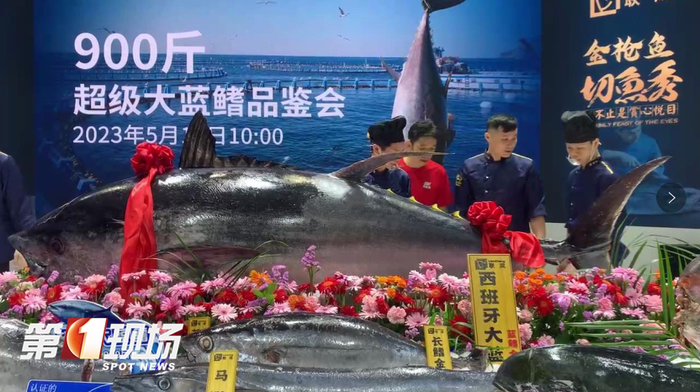 记者在现场看到,重达900斤、身长超过2.3米的冰鲜蓝鳍金枪鱼被放置在展位上,多名切鱼师联袂献技,为观众上演难得一见的开鱼秀。这条“巨无霸”蓝鳍金枪鱼,堪称国内渔业展会上最重磅的“鱼王”。