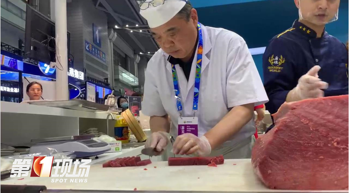 在5月11日开幕第一天,现场切开的金枪鱼也达到了370公斤。“大脂(大腹)是金枪鱼最好的部位,大概4000元一公斤。背部也就是赤身,因为金枪鱼经常游泳,血红素含量高,也要800元一公斤。”中农发集团负责人介绍。开鱼仪式后,该公司组织展会观众免费品鉴,吸引大批观众排队领取。