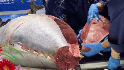 拍卖现场最受关注的,是在展会现场深圳渔业发展建设展厅中展示的重达327公斤的蓝鳍金枪鱼,这条具有特殊意义的蓝鳍金枪鱼王,一经拍卖师的介绍,便受到竞拍者的热情追捧。在不断的举牌竞价后,最终以198万的价格被深圳一家日本料理店拍得。