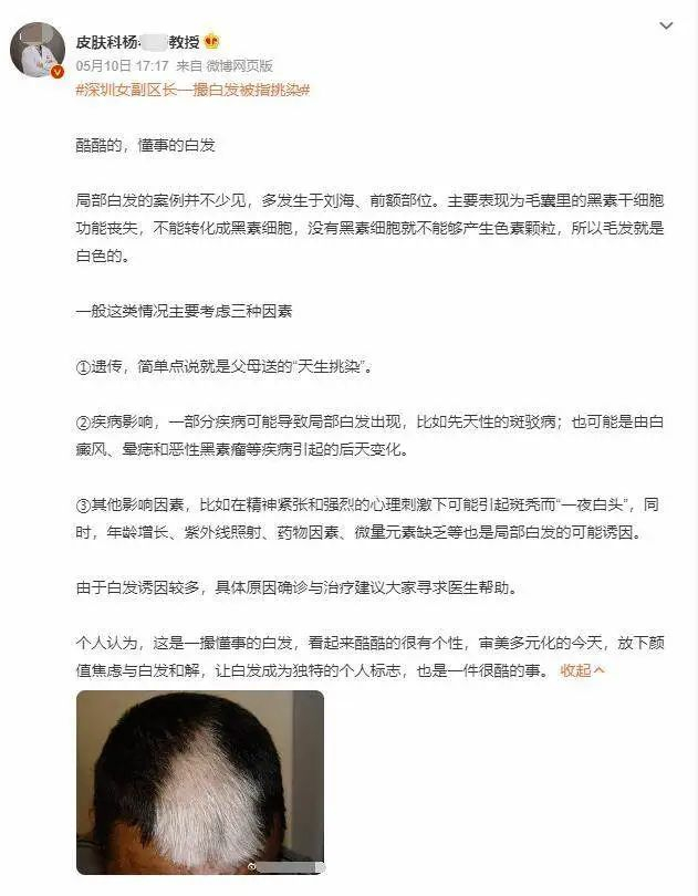 在微博认证为陆军军医大学西南医院皮肤科的杨希川教授发文分析,局部白发的案例并不少见,多发生于刘海、前额部位。主要表现为毛囊里的黑素干细胞功能丧失,不能转化成黑素细胞,没有黑素细胞就不能够产生色素颗粒,所以毛发就是白色的。