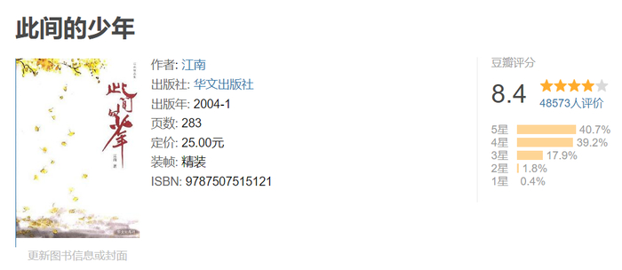 近日,本案有了终审判决结果,广州知识产权法院认定构成著作权侵权和不正当竞争,判令江南立即停止不正当竞争行为,并登报声明消除影响,赔偿经济损失168万元及为制止侵权行为的合理开支20万元,两家出版公司即北京联合出版公司、北京精典博维公司就其中33万元承担连带赔偿责任。此外,法院还明确《此间的少年》如需再版,则应按再版版税收入30%支付经济补偿。