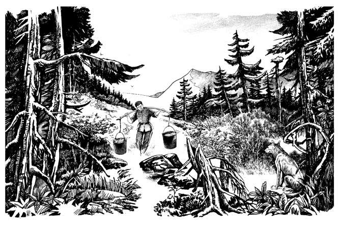 那是初春的一个傍晚,我在河边挑完水往回走,突然看到二十来米开外的林子边有一只孤狼,它站在那里,两眼直勾勾地盯着我。我的头发和汗毛瞬间竖了起来,怎么办?是扔下扁担赶紧跑,还是抄起扁担和它拼?我略微让自己冷静一下,装作没看见它似的继续朝前走。就要走到狼跟前了,心已经提到嗓子眼……我想把水桶放下,单拿着扁担走,这样万一它冲过来,用扁担也可以抗衡一阵子。我不敢甩掉水桶,生怕动作大了会招惹它,谁知在我屈身放下水桶的那一刻,狼竟然掉头,往林子里去了。我没有再去挑水桶,而是握紧扁担,惴惴不安地朝前走;我不敢跑,也不敢回头,我感觉那只狼正凝视我的背影……直到进了外站的栅栏,我才把扁担撇掉喊道:“我遇上狼了!我遇上狼了!”