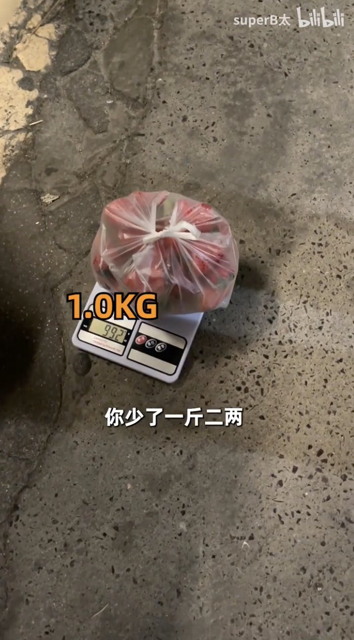 口口声声说着三斤的草莓,放到B太的自带秤上就成了两斤,对比具体数字,足足少了一斤二两。
