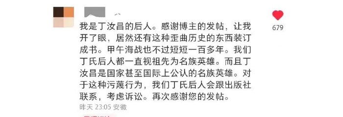 他说:甲午海战距今不过短短一百多年,这种歪曲历史的东西就被装订成书,对民族英雄肆意污蔑,他感到无比震惊。