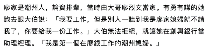 “大哥能怎么办呢,他又不能对小自己二十几岁的弟媳妇发火呀。”于是廖汤慧霭如愿去了廖创兴银行上班。