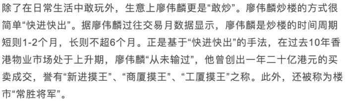 但作为廖氏家族的第三代,廖伟麟不是只会吃喝玩乐,多年来他深受母亲廖汤慧霭的影响,在写字楼、铺位及车位等房地产投资上战果累累。