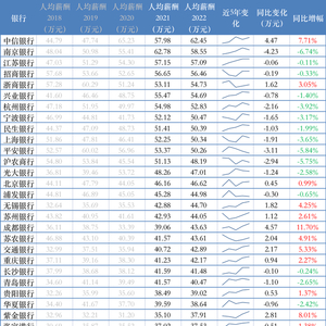 具体来看,渝农商行、南京银行、平安银行、沪农商行、厦门银行人均报酬降幅超过5%。从金额变化来看,南京银行人均收入下滑最多,由上年的62.78万元降至58.55万元,人均减少4万多元;渝农商行、平安银行人均减收超过3万元。