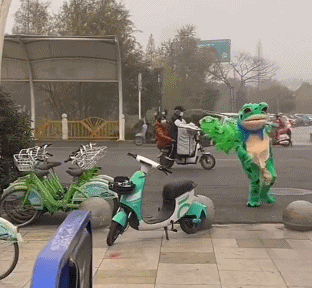 今年4月,浙江宁波海曙区交警正在路口执勤,发现有人穿着“网红蛙”的人偶服骑着电动自行车出行,交警将其拦下,发现骑车的是一名男子,没有佩戴安全头盔。