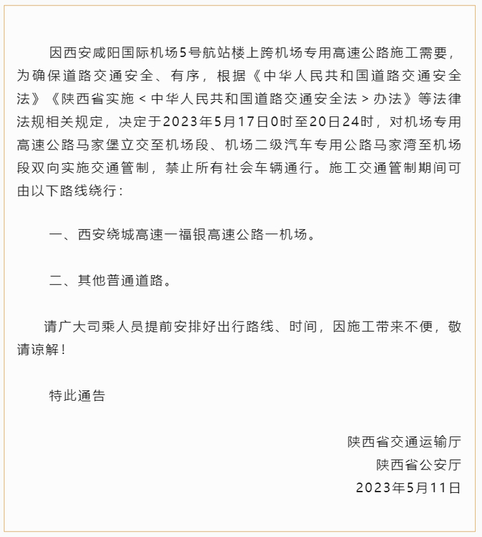 根据陕西省交通运输厅和陕西省公安厅近期发布的《关于机场高速公路施工实施交通管制的通告》,为方便旅客朋友们出行,在尽量多地保留机场巴士经停站点的前提下,经研究决定,自2023年5月16日(下周二)起,至2023年5月21日(下周日),对西安机场巴士部分线路进行如下临时调整: