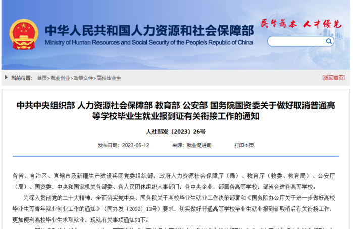 近日,人社部官方网站发布通知:2023年起,不再发放《全国普通高等学校本专科毕业生就业报到证》和《全国毕业研究生就业报到证》,取消就业报到证补办、改派手续,不再将就业报到证作为办理高校毕业生招聘录用、落户、档案接收转递等手续的必需材料。