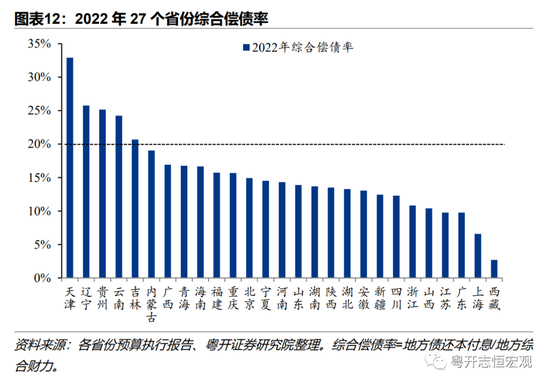 3、从债务指标来看,疫情冲击地方政府综合财力,导致地方债务率上升。以负债率(政府债务余额/GDP)衡量,截至2022年末,青海和贵州负债率超过60%,分别达到84.3%和61.8%,而江苏、上海和广东经济实力强劲、负债率低于20%,分别为16.8%、19.1%和19.4%。由于河北、黑龙江、甘肃、江西4省尚未对外披露2022年末中央对地方转移支付数据,无法计算地方综合财力和债务率。以债务率(政府债务余额/地方综合财力)衡量,本文计算的27个省份中,有23个省份的债务率高于100%警戒线,其中,天津高达295.7%,吉林、云南、辽宁、贵州、福建、重庆、青海债务率超过150%,显示地方债务形势与财力不匹配。债务率最低的是江苏(73.3%)、上海(65.7%)、西藏(21.3%)。部分地区地方财力受疫情冲击严重,导致债务率大幅上升,天津、吉林一般公共预算收入同比下滑超10%,政府性基金收入同比下滑超60%。