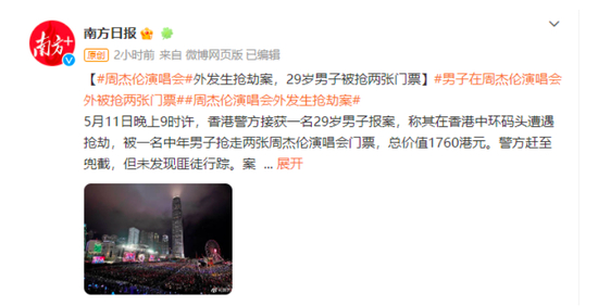 一名中年男子抢走两张周杰伦演唱会门票,总价值1760港元。