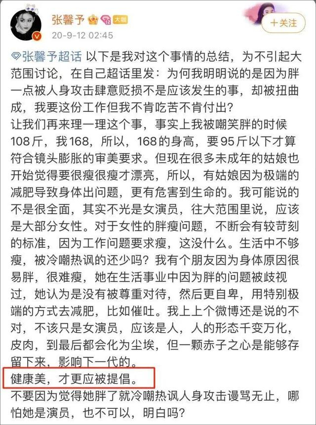 2020年,张馨予也曾在微博上谈过身材的问题,身高1米68的她,108斤被嘲笑胖:“事实上我被嘲笑胖的时候108斤,我168,所以,168的身高,要95斤以下才算符合镜头膨胀的审美要求。对于女性的胖瘦问题,不断会有较苛刻的标准,因为工作问题要求瘦,这没什么。生活中不够瘦,被冷嘲热讽的还少吗?……健康美,才更应被提倡。”