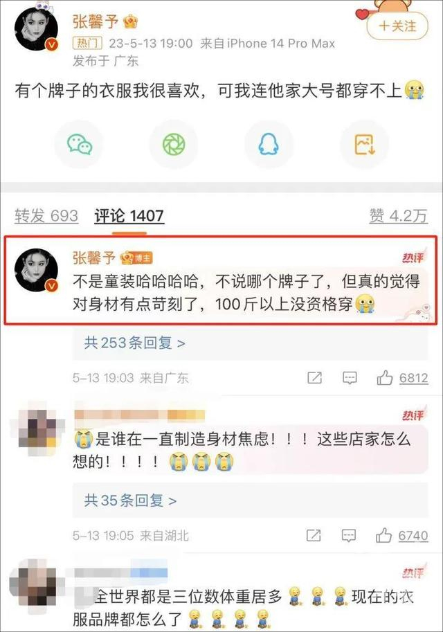 张馨予说:“有个牌子的衣服我很喜欢,可我连他家大号都穿不上……”文末附上哭的表情,并在评论里回复称:“不是童装哈哈哈哈,不说哪个牌子了,但真的觉得对身材有点苛刻了,100斤以上没资格穿。”