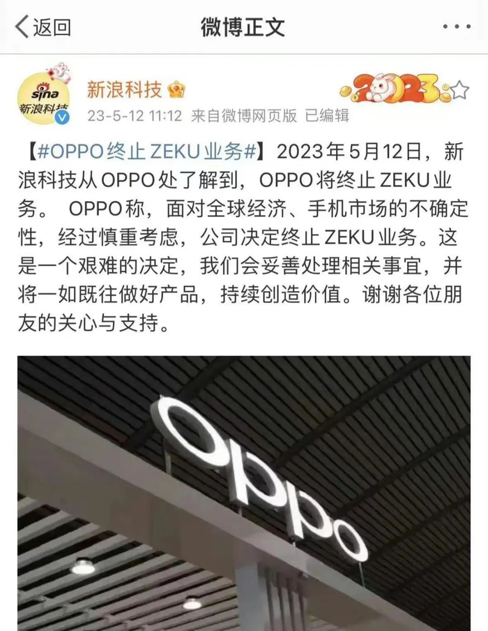 OPPO官方在公告说:这是一个艰难的决定,面对全球经济、手机市场的不确定性,经过慎重考虑,公司决定终止ZEKU 业务。