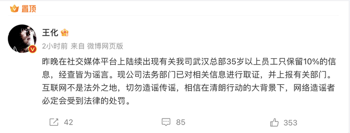 刚刚,小米辟谣“武汉总部35岁以上员工只保留10%”的传闻。