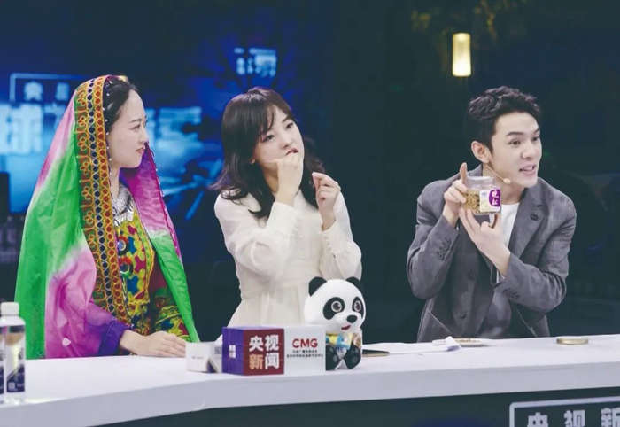 (视频截图) 2021年11月6日,李佳琦(右)、CMG的普什图语主播陈冲(左)、CMG记者王冰冰在第四届进博会上直播推广产品。