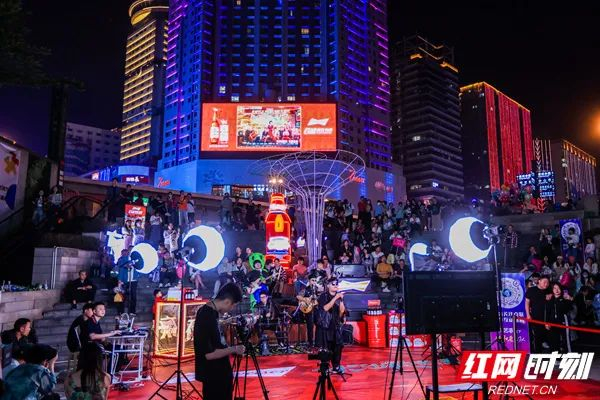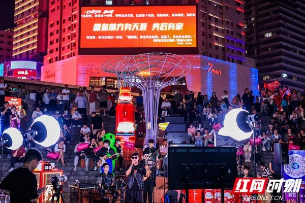再见杰克、失恋阵线联盟、红日、吻别等经典歌曲在现场陆续上演,此时,现场仿佛变成了一个演唱会,户外LED大屏变身为音乐提词器,滚动播放着歌词,情侣们紧紧地攥着对方的手,朋友间肩并肩,对着提词器,跟着乐队一起忘情嗨唱,或有韵律地挥动手机当荧光棒,或有节奏地摇摆,开启热辣难忘的长沙夜生活。