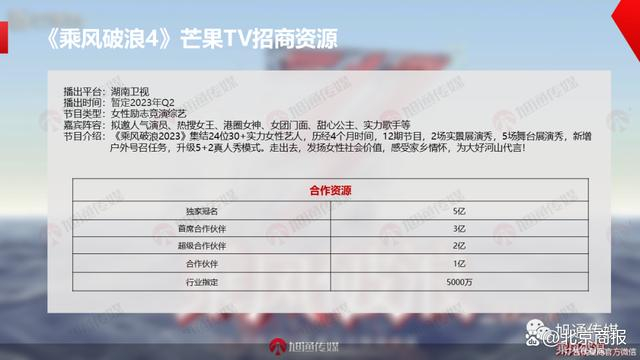 芒果超媒2022年年报显示,《浪姐4》为2023年重点项目。据《浪姐4》播出平台芒果TV的广告代理商旭通传媒数据,《浪姐4》的独家冠名报价为5亿元,而首席合作伙伴、超级合作伙伴、合作伙伴分别为3亿元、2亿元和1亿元,行业指定的费用为5000万元。由此计算,《浪姐4》首轮招商费用超10亿元。